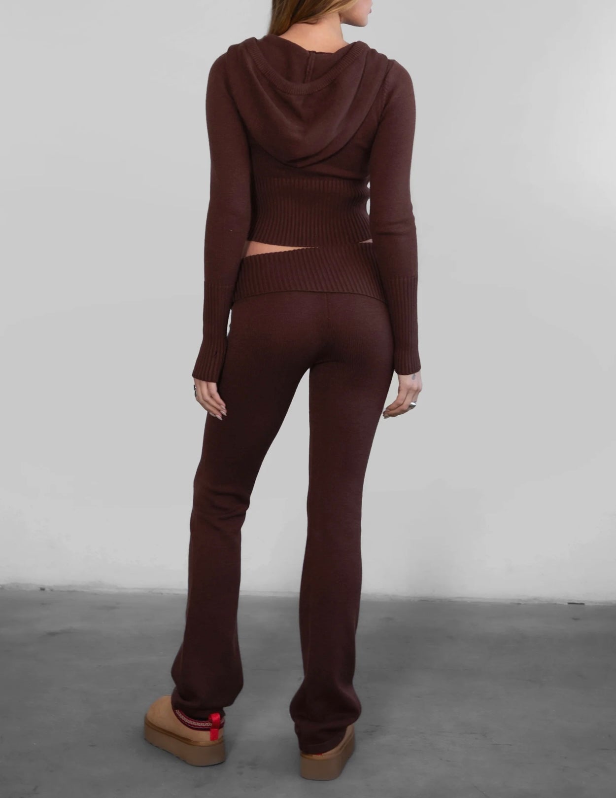 -Sweater Knit Two Piece Set -Cropped Zip Up Hoodie With Drawstrings-Ribbed Cuffs and Waist -Knitted Fold Over Flare Pants-Figure Hugging Stretch Knit Fabric